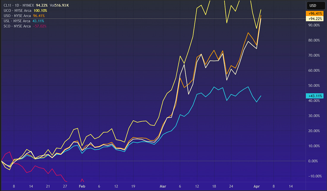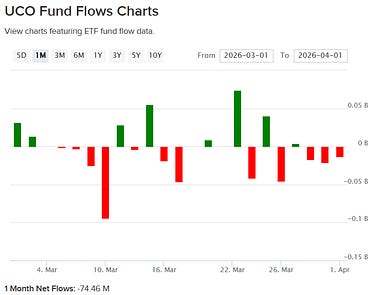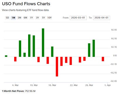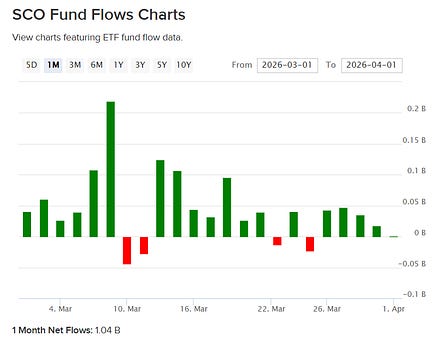This was the week when on this side of Suez we truly started to feel the impact. ICE gasoil at $200/bbl, refineries fighting over cargoes, flows rotating east, and prices at the pump moving higher… but what about futures? why haven’t those exploded higher? After Trump’s speech, we saw some tightening in futures, not in outright price, but in the shape of the curve, with prompt spreads at all-time highs, trying to reflect what we’re seeing in the physical market where physical premiums are blowing up (Brent and WTI—Dubai is dead). However, in absolute terms, front-month futures still look hesitant, near the highs of recent weeks but nowhere close to reflecting what’s actually happening on the ground. So this week, my head revolved around one question: who is selling futures? Beyond the usual manipulation concerns, the reality is that this market is too large to intervene directly… but what about indirectly? First, let’s identify the players in the futures market. Contrary to what many think, speculative flows are not the dominant force here. The physical market is—if you combine swap dealers and producers (or trading houses), who use futures as a natural hedge. Then you have other reportables… a bit of a black box, but my suspicion is that this bucket includes structured products—particularly those ETFs tracking oil—and that part of the distortion we’re seeing in futures, especially in the Brent/WTI spread, may be coming from there. I picked the four most popular ETFs: USO, ULS, UCO, and SCO… together they don’t even reach $5bn in AUM, so the answer is probably no, but there are still some interesting takeaways. UCO and SCO in particular—leveraged ETFs delivering 2x daily returns (UCO) and -2x inverse exposure (SCO)—saw trading volumes explode during March. But what are they actually tracking? These instruments, popular among the more aggressive crowd, replicate the Bloomberg Commodity Balanced WTI Crude Oil Index (BCBCLI), composed of roughly 33% front-month, 33% Dec26, and 33% Jun27 exposure via WTI futures or dedicated swaps—which means they’re not really trading the May contract. Next is the most well-known: USO, the largest with around $2bn in AUM, with a much simpler structure—100% long front-month futures. ULS is also long WTI but distributes exposure evenly across the next 12 months. One thing to point out though, is that these ETFs not necessarily are positioned 100% on future contracts, at least not directly, since they can achieve the investment purpose (ie.. replicating the daily variation of oil) with “total return swaps” they get from banks. Now, I would like to believe that those bank turn around buy/sell futures to offset the swap positions, but might not be always the case. You can clearly see how each structure performed given how the curve moved recently. But what stood out to me was the net flow into these ETFs—particularly SCO, which has to sell contracts every time new shares are created. The fact that such a highly speculative instrument—one that’s not even meant to be held overnight—trades more volume than the most popular ETF is, at the very least, interesting. It’s likely that equity funds are using SCO as a hedge against portfolios with energy exposure, which rallied more than 30% during March. The problem, as with all leveraged ETFs, is volatility decay/beta slippage, which drives these products toward zero over time—meaning they’re typically held for no more than a few days, maybe a week. This could partly explain why the back end of the curve looks depressed—but not why the front month remains capped. One important factor to consider is the roll. WTI futures typically expire around the 20th of each month (Brent on the last day), as they are physically deliverable contracts and require about 10 days to coordinate logistics before the delivery month begins. Ahead of expiry, these funds start rolling positions into the next month—for example, selling May and buying Jun if they’re long, or the opposite if they’re short. To avoid being front-run, they spread this activity over 3 to 5 days. During the roll, the structure of the curve, known as “roll yield”—becomes critical. If you sell 1,000 May contracts at $111 and buy 1,000 Jun at $98, that’s a $13 gain that flows directly into the fund’s NAV… an extreme case, but if we somehow reach mid-April with spreads like this, you know what to buy. Another way to play these instruments is through volatility. If this dislocation lasts another 2–3 weeks, shorting these ETFs could be a way to extract some carry. Going back to the original question, are ETFs responsible for the weakness in futures pricing? I don’t think so. But they’re definitely not helping push prices higher either. The producer merchant flow, is a constant one, and with less physical barrels to hedge, I doubt where we could see selling pressure.. if any refineries should be bidding up in case they actually manage to get a cargo. One explanation I can find around that is that they are hedging oil exposure with gasoil futures.. because of GO limited upside on demand destruction?? Maybe the real question isn’t who’s selling futures… but whether there’s anyone left buying? It appears that “Long Oil” is not a crowded trade…... Keep reading with a 7-day free trialSubscribe to Oil not dead to keep reading this post and get 7 days of free access to the full post archives. A subscription gets you: