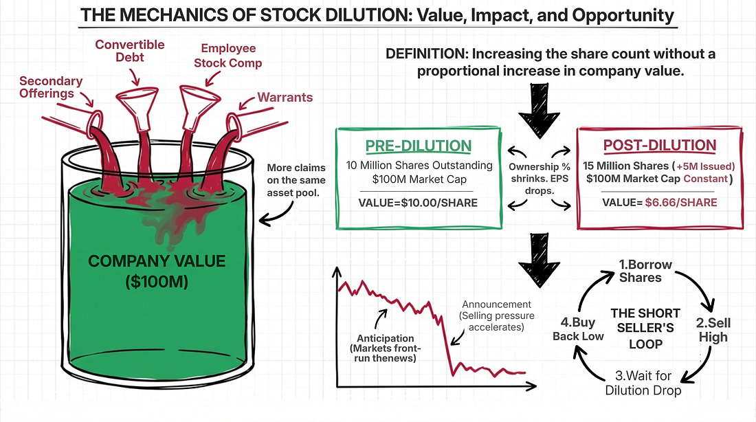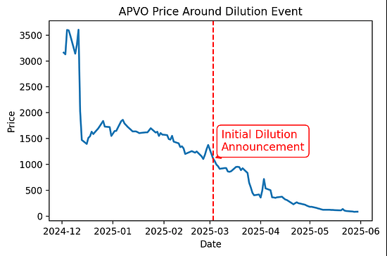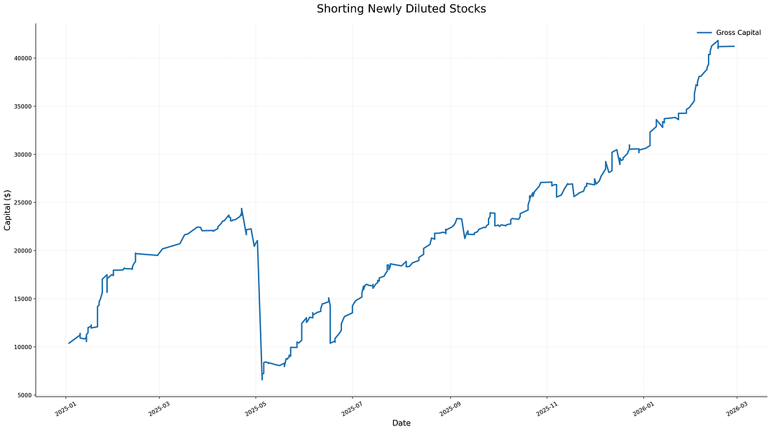 However, this is essentially the tip of the iceberg: The real edge comes from turning things that happen in the market and making them an event. To see an example of this, let’s take a look at a understudied, but common market-happening: Dilution At a high level, dilution is pretty simple. A company needs more cash and won’t or can’t take out a loan from the bond market. So, it simply issues new shares and sells them on the open market. With those proceeds, it can do whatever it pleases; raise exec salary, increase R&D funding, pay off other debts, whatever. Now, naturally, this isn’t risk-free cash. If you’re an investor in one of these companies and get told that your 5% stake is now going to be a 3% stake, you’re going to be less-incentivized to hold it, let alone buy more shares. And you’re not alone; the same dilution happened to the other 3,000 investors and they have the same view too. When all of those participants have the same view, on the same stock, at the same time, the net result gets pretty predictable: At this point, you might think to yourself: “Why not just short companies when they’re diluting their shares?” Well, you can. This is the core of the next tranche of event-driven trading:
