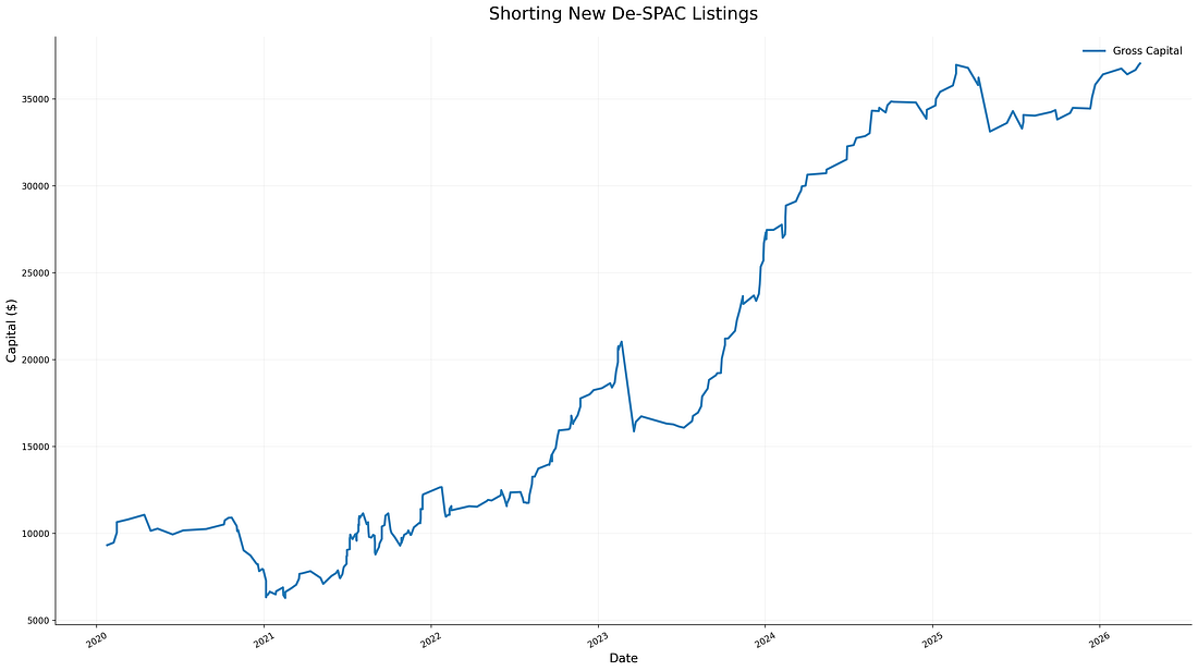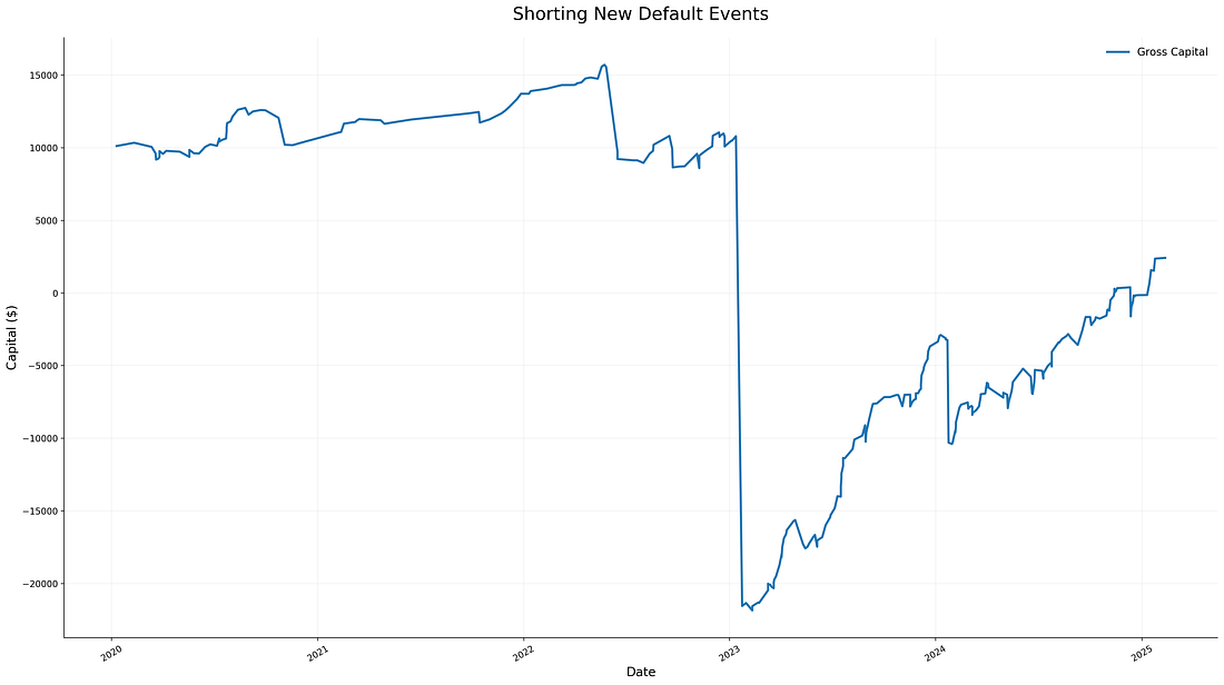 Once we have them all ordered by date and time, we then want to see what happens if we outright short them for a month. Now, before moving further, we have to address a very important stage of where event-driven modeling goes wrong: lookahead bias. Although you can know about the event as soon as it happens, it is very risky to assume that you can or would have traded it exactly when it happened. If you model on the basis that you traded right as the event happened, it often makes returns look much better than they actually were. So, going back to the strategy; we’re going to add a full day delay between when the event was logged and the time of trading. If we got word of the event on Jan 1 at 10 am, we place a trade on Jan 2 at 4 pm. This comes with drawbacks of its own, but it at least gives us a more realistic baseline that would match practical trade execution. So, with our strategy and universe defined, let’s run a few mock simulations: As demonstrated, from a birds-eye view, this approach isn’t all too bad. Naturally, by the nature of short-selling, since our max gain is 100% (stock falls to 0), and our max loss is virtually infinite (no cap on how high a stock can go), we inevitably hit periods where a stock we’re short goes 3, 4, even 10x higher, in a month. It’s a rare event, but one that is guaranteed to eventually happen, as we’ve painfully experienced before: But also coming from experience, we know that diversification is one of the last free “edges”, so by combining each event into a multi-strategy framework, we lessen the impact of the odd adverse event, while still capturing the bulk of the EV. Now, as with all trading strategies there is always some nuance between backtesting and reality: