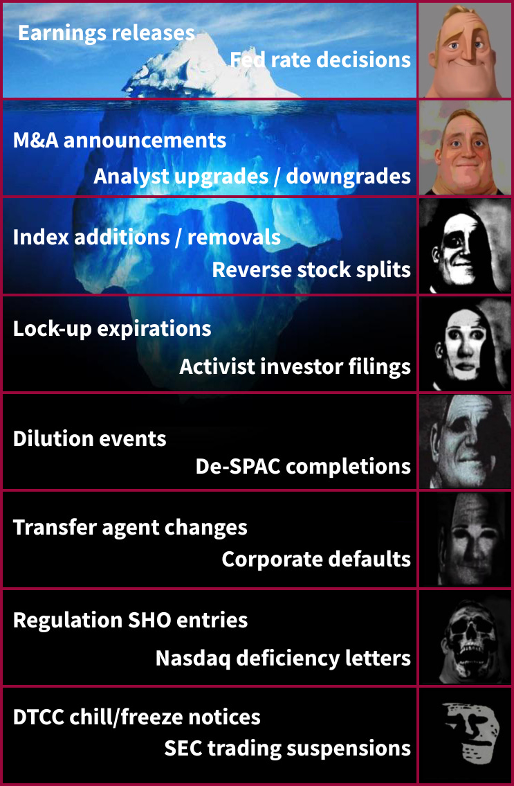 A Junior Quant's Guide to Event-Driven TradingThe best model in the world can’t beat having better information. And we have it.When you see a stock with performance like this: You have to know that it didn’t get that way overnight. And more often than not, it didn’t get that way quietly. On every step of the way down, companies like this are forced by regulators to publicly share every detail on exactly how business is going and what they’ve got planned. All you have to do is look for it. So, that’s exactly what we did. A Primer on Advanced Event-Driven TradingFor a quantitative trader, you have to know that the “quantitative” part can only go so far. At the end of the day, markets are driven by information, above all else. Even for purely quantitative strategies like stat arb, that information component can cloud up returns as it’s really, really hard to hedge against a company that just announced it’s going bankrupt and went down 75% overnight. By going the event-driven route, you’re still working with data and markets, the only difference is that the event happening is the signal. Now, none of this might be news to you. You’re likely already familiar with the most typical market events:
