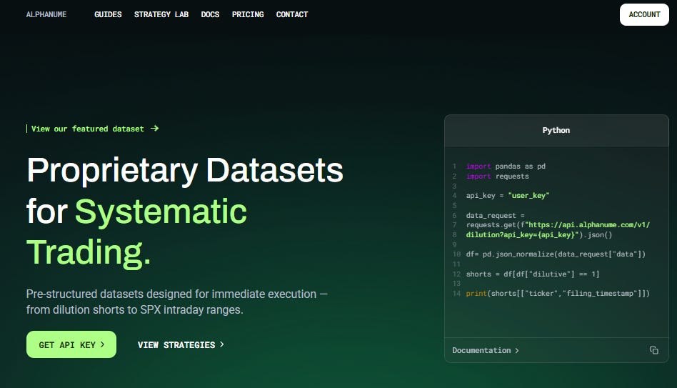 Closing ThoughtsThe beauty of event driven trading is that as long as markets are open, there will constantly be new happenings. We’ve demonstrated that if you’re willing to dig past the first layer of garden-variety earnings and FOMC meetings, you open up a new world of repeatable, highly predictable trades. As with all trading strategies, while things aren’t necessarily a money-printing, straight line up, once you know the nuances of the approach, you will at least always know where to look when you’re in need of an edge. Like usual, the full code for the experiment we ran will be posted below, along with a production file that you can run to get a simple view on the latest actionable events, as they come in real-time: Code → Alphanume Strategy Lab on GitHub Where This All Comes FromFor this experiment, we used price data from Massive and point-in-time event data from Alphanume. As we mentioned in our Inside the Quant Galore Research Lab, we had spent years building an internal dataset catalog to research and trade off of. Alphanume is simply the system we built for ourselves to experiment, take real risks, and to see which ideas survive outside of a code terminal. Instead of manually parsing filings or stitching datasets together ad hoc, you can go straight to: