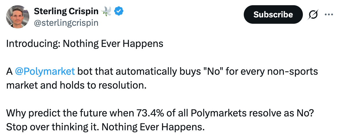 So Bloomberg’s Bernard Goyder reports on prediction markets: There are numerous reasons why institutional traders have not joined in, including the lack of regulatory clarity and the relatively light volumes compared with the other areas where they operate. But a new academic paper points to another potential reason: Some of the basic tools that sophisticated traders use to manage risk in other markets aren’t available in event-based bets. At the most basic level, most market makers offset their risk in one type of trading by hedging with other related assets — for options markets, they can do this in the underlying stock market. That is much less easy when the bet is on a celebrity wedding or an election, according to the paper published by Nick Palumbo, a former product manager at the sports betting site DraftKings Inc. Here is Palumbo’s paper, “A Microstructure Perspective on Prediction Markets,” finding that market makers on prediction markets don’t really earn bid/ask spreads so much as they make directional bets on events: Passive liquidity providers systematically absorb residual demand imbalances and retain outcome-dependent exposure through contract resolution. Profitability appears to depend less on classical bid-ask spread capture and more on managing terminal risk associated with dynamic supply creation. These findings suggest that liquidity provision in event-contract markets shares structural similarities with underwriting rather than traditional inventory-neutral intermediation. I guess my point would be that neither sports bookmaking nor stock prop trading is entirely “traditional inventory-neutral intermediation”; Jane Street does not just earn a bid/ask spread on all of its trades. From his findings: Across the full NFL season: Passive liquidity providers accumulated net exposure in the direction of realized outcomes in the majority of markets In most cases, they had a terminal asset on one outcome and a terminal liability on the other Aggregate profitability was positive (approximately $29 million) On average, the sum of terminal assets was greater than the sum of terminal liabilities Weekly P&L exhibited significant volatility, with pronounced drawdowns during adverse weeks LPs [liquidity providers] are winning on average, but are not without weeks of significant losses Yeah I mean seems fine? The job is to make markets where you have a positive expectation, and to win more than you lose. Elsewhere: Right, see, that’s (one-sided) model-based positive-expected-value [6] passive liquidity provision. Prediction market resolution | In general, event contracts on prediction markets pay $1 if an event happens and $0 if it doesn’t. But how do you know, in general, if an event has happened? Or rather, how does the prediction market know: How does it decide whether to pay out the Yes contracts or the No contracts? There are some events that have official results. Major League Baseball has a mechanism for deciding the winner of the Mets game, and a sportsbook or prediction market will probably defer to the official mechanism. The Oscars have official results. US elections, so far, have had official results. But most events in the world do not have official results. There is no official objective arbiter of whether US ground troops have entered Iran. The people who might know — the US military, the Iranian military — might not want to tell you. Or — as we discussed last week — you might know all the facts, but still not be sure whether those facts mean that “US ground troops have entered Iran” in the relevant sense. So who decides, and how? The most straightforward answer would be something like: - The prediction market is a regulated financial exchange with a lot of lawyers.