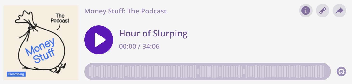 | This week’s episode of the Money Stuff podcast is out now, in which Katie and I discuss the weather, NewBird AI, Long Blockchain, floating-strike convertible financing, meme AI diversification, dot AI, the meme ETF, public listing option value, shareholder voting, Exxon’s grudges, comptroller trolling, the horrifying sounds of coffee grading, spot vs. futures commodity quality and banks foreclosing on shrimp to eat it. You can listen to this week’s episode here: You can get Money Stuff: The Podcast at Apple, Spotify or wherever you get your podcasts. We’d love your feedback. You can email us at [email protected]. |